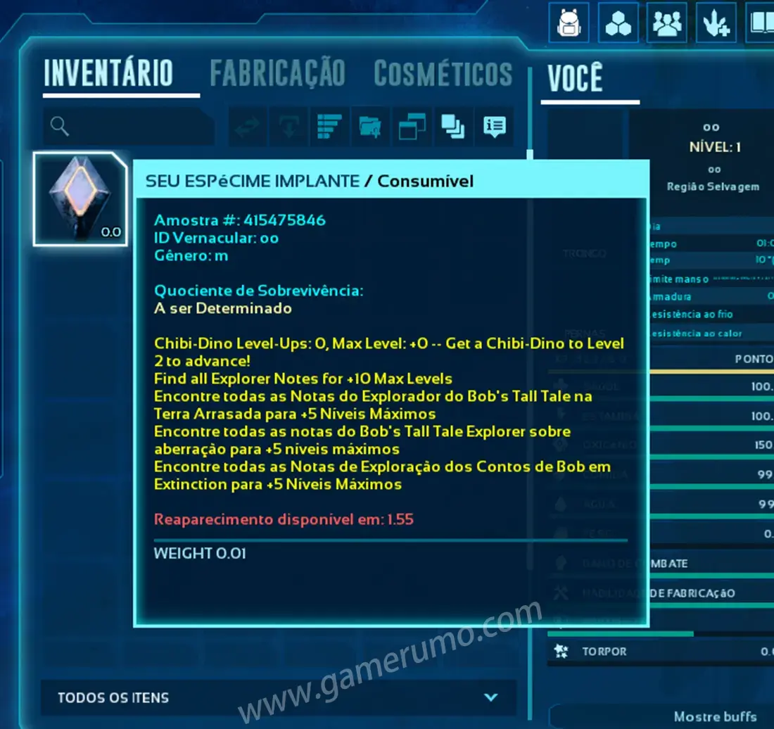 PC: Pressione I para abrir o inventário. Coloque o mouse sobre o ESPÉCIME IMPLANTE, aguarde 5 segundos, espere o texto vermelho desaparecer e então pressione E para morrer instantaneamente.
